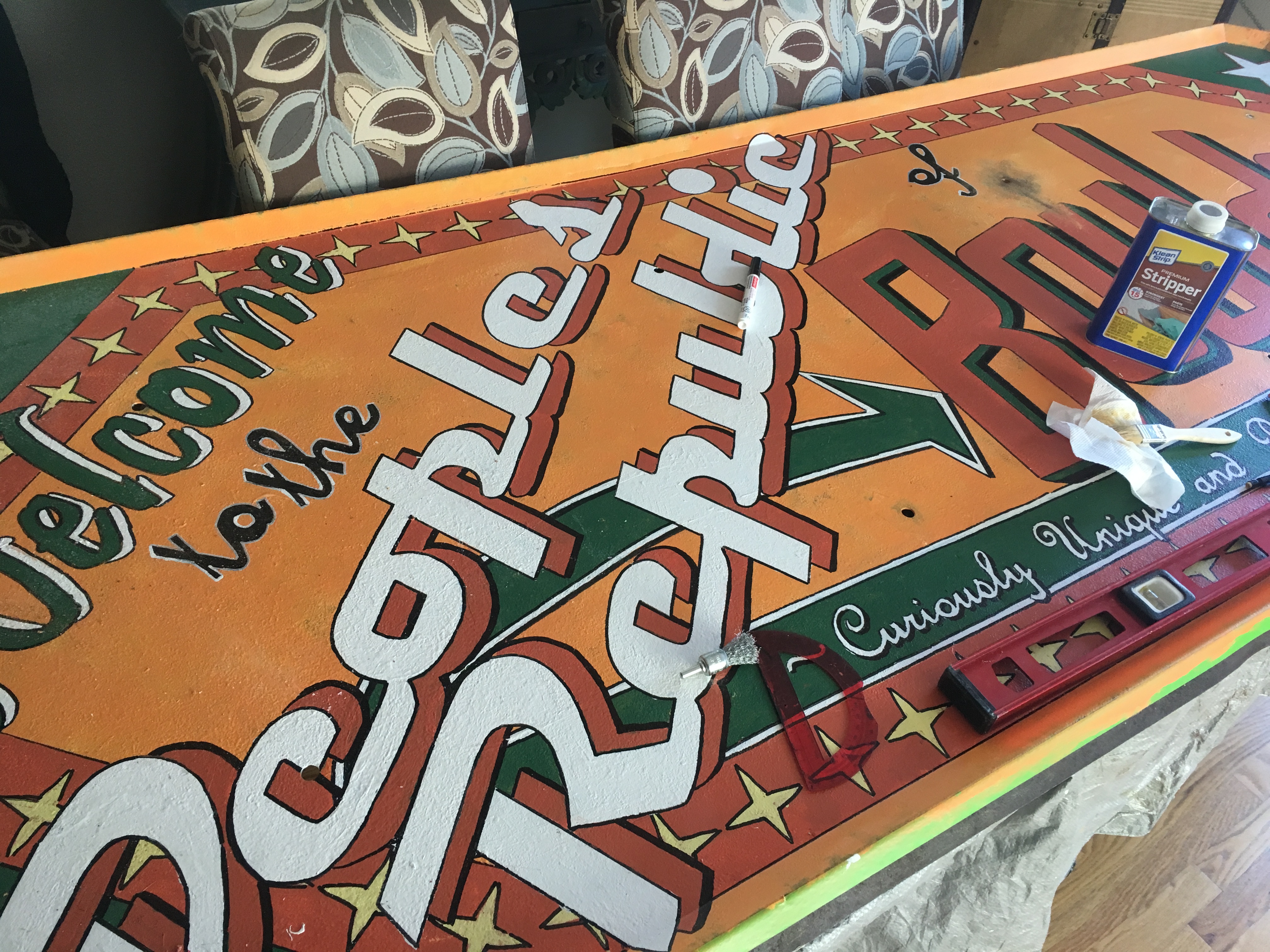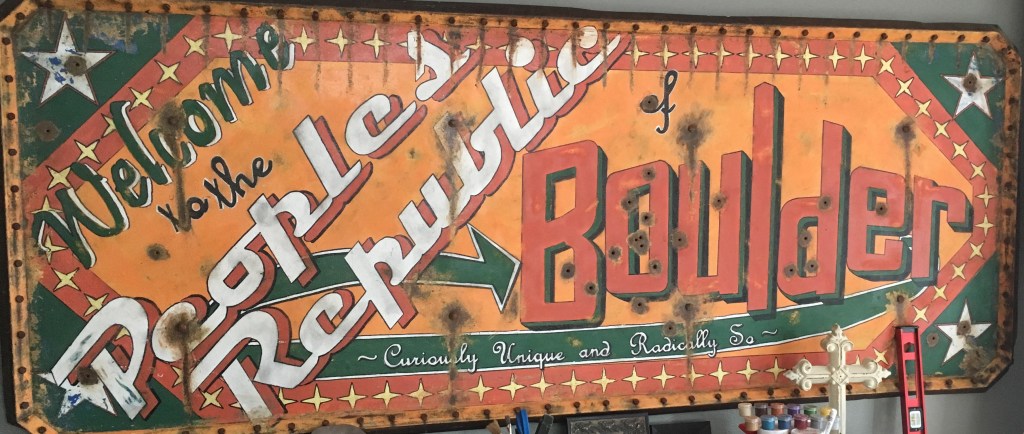 “Vintage” sign designed, painted, built for Boulder’s own Gasoline Lollipops. Built with LOVE and light materials and hinges in the middle to make foldable for ease of transport